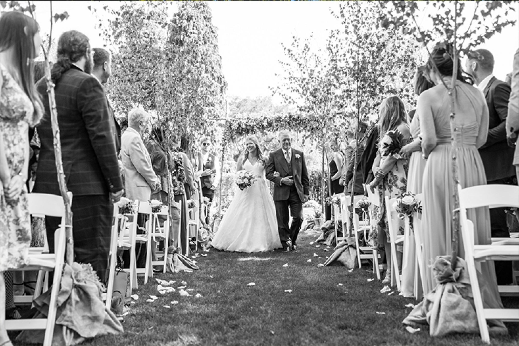 Embracing organic, natural materials and textures, birch trees were used to line the aisle for the outdoor ceremony in the Victorian Summerhouse while roses, herbs and eucalyptus adorned the chairs beside the aisle.