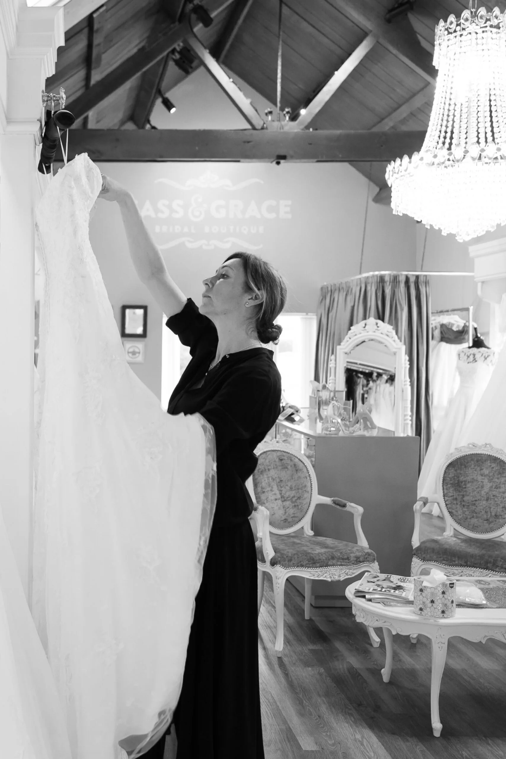 Sass & Grace occupies a huge bright and airy space on a converted dairy farm just outside Winchester. From the bespoke seven-foot mirror to the Empire French chandelier hanging down from the huge oak beams, it’s a peaceful place to find your perfect dress.